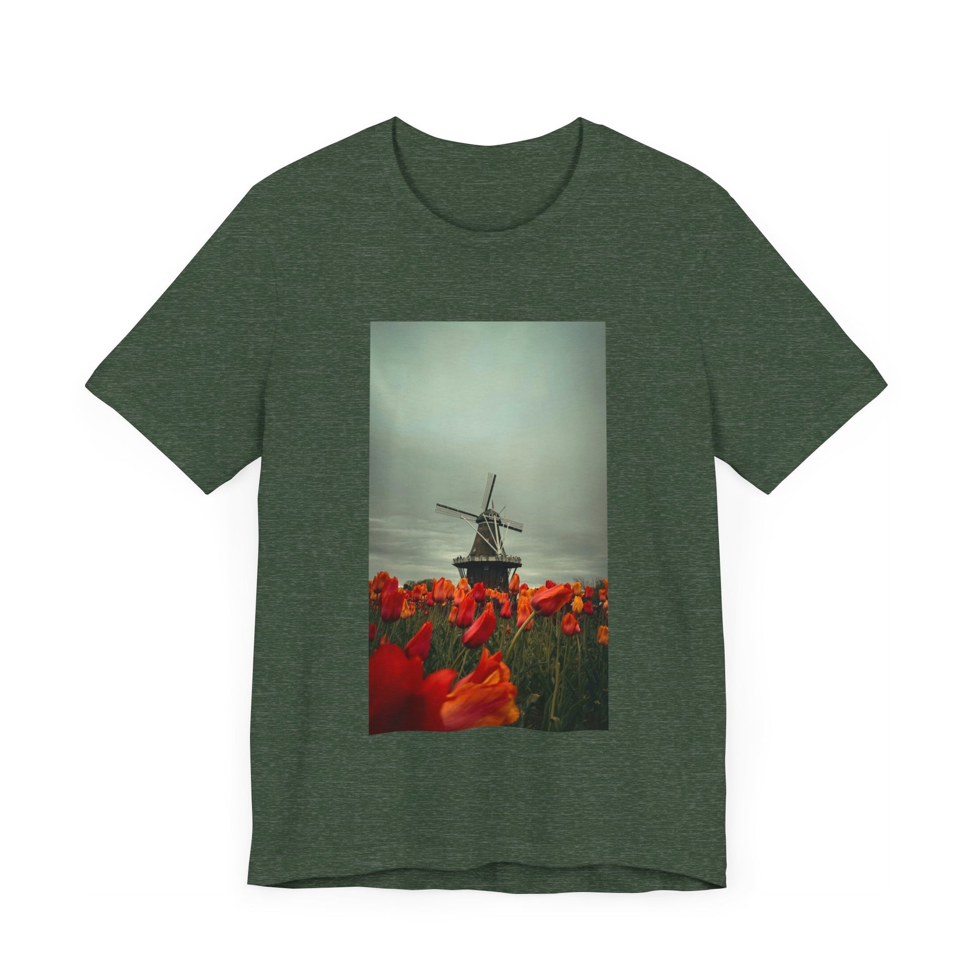 Capture the picturesque charm of Holland with this classic unisex jersey short sleeve tee featuring an image of vibrant bulbfields and a traditional windmill. Soft cotton and quality print make users fall in love with it over and over again. These t-shirts have ribbed knit collars to bolster shaping. The shoulders are tapered for a better fit over time. Dual side seams hold the garment's shape for longer.
